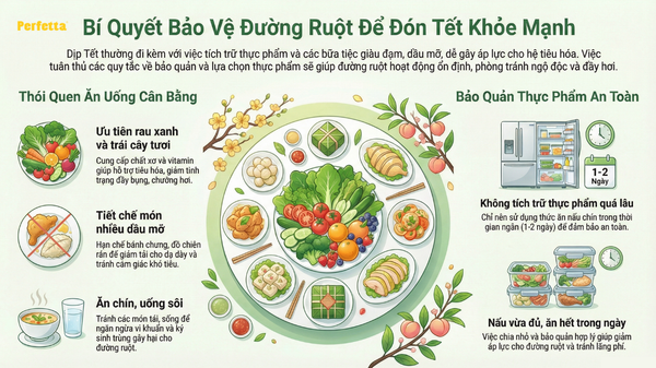 Một chế độ ăn uống hợp lý trong dịp Tết sẽ giúp đường ruột hoạt động ổn định, cơ thể nhẹ nhàng và tinh thần thoải mái hơn. Chủ động chăm sóc hệ tiêu hóa chính là cách đơn giản nhưng bền vững để bạn tận hưởng trọn vẹn không khí Tết và khởi đầu năm mới một cách khỏe mạnh, an tâm.